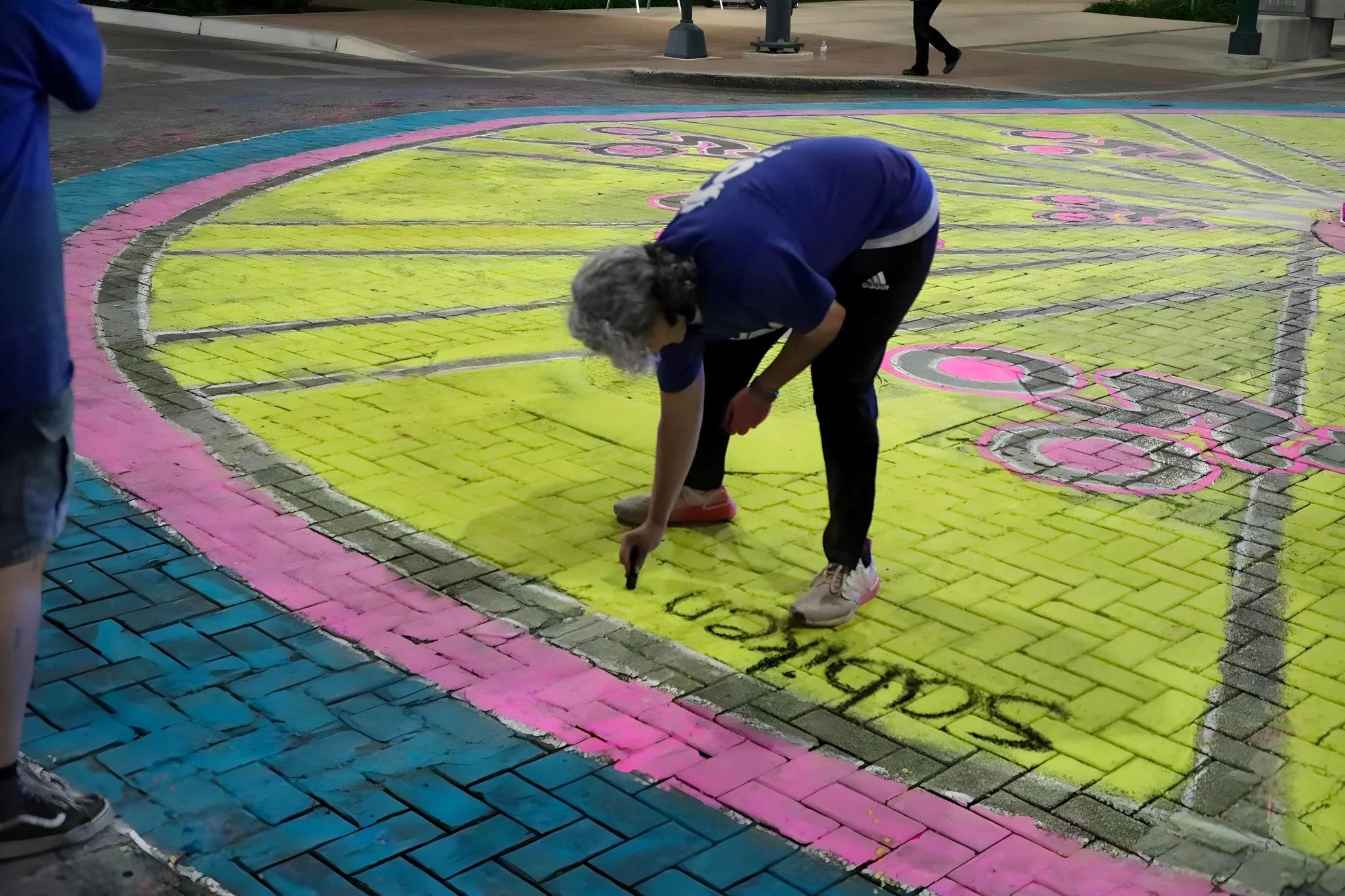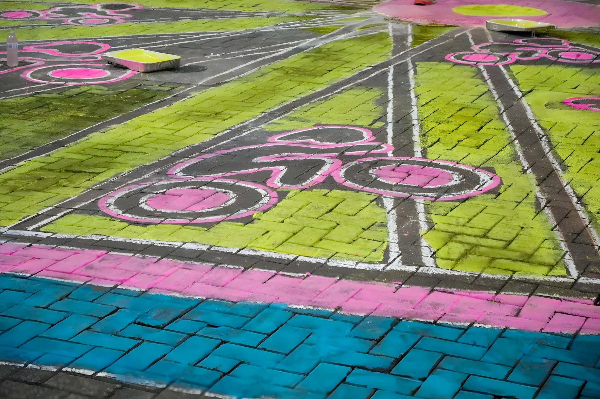A lively palette of yellow, aqua, and pink stretched across the pavement, creating a sense of momentum and welcoming all passersby to imagine themselves in the scene. This bright color story also echoed the city’s vision for a more connected, safer, and more people-centered transportation network.